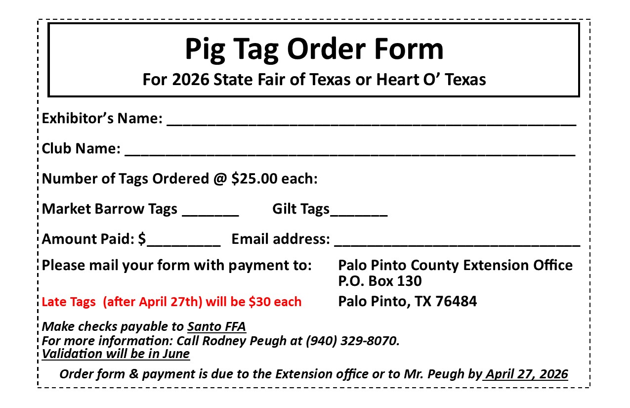 - Swine tag orders due for 2026 State Fair or Heart O’ Texas – (there will be another opportunity to order swine tags in September for 2027 County Show and Spring Major Shows)