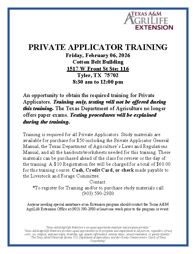 The next Private Applicator Training will be Friday, February 6th–8:30 AM-12 Noon